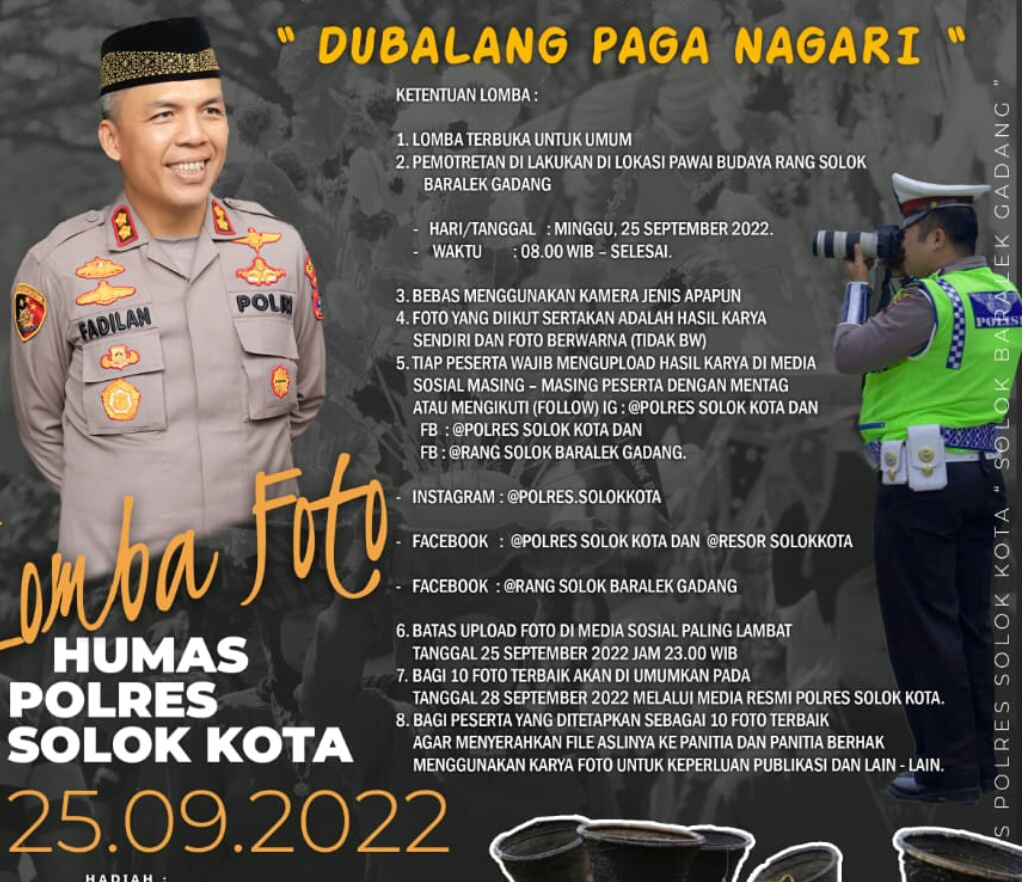 Dikatakan, Kegiatan terbuka untuk umum pada Minggu, 25 September 2022. Peserta bebas mengambil foto atau melakukan pemotretan dengan objek polisi yang sedang bertugas di lokasi atau di sepanjang kawasan tempat dilaksanakannya event Rang Solok Baralek Gadang.