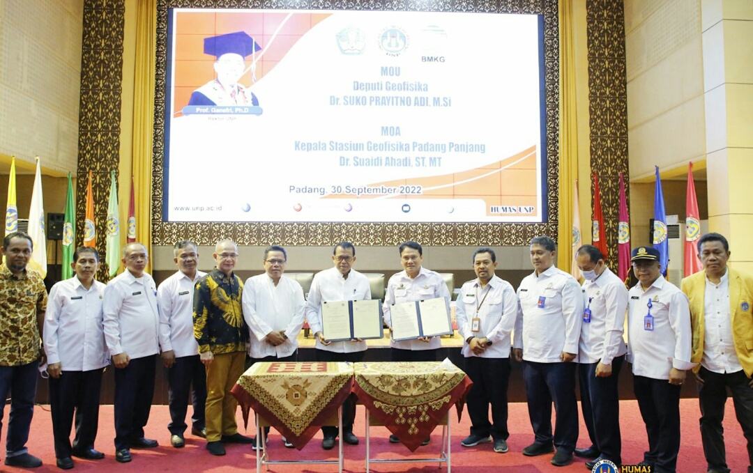 Ditanda tangani oleh Rektor UNP, Prof. Ganefri, Ph.D dan Deputi Geofisika BMKG, Dr. SUKO Prayitno Adi, M.Si. Selain penandatanganan MoU antara UNP dengan BMKG juga dibuat perjanjian kerja sama antara Fakultas Matematika dan Ilmu Pengetahuan Alam dengan BMKG.