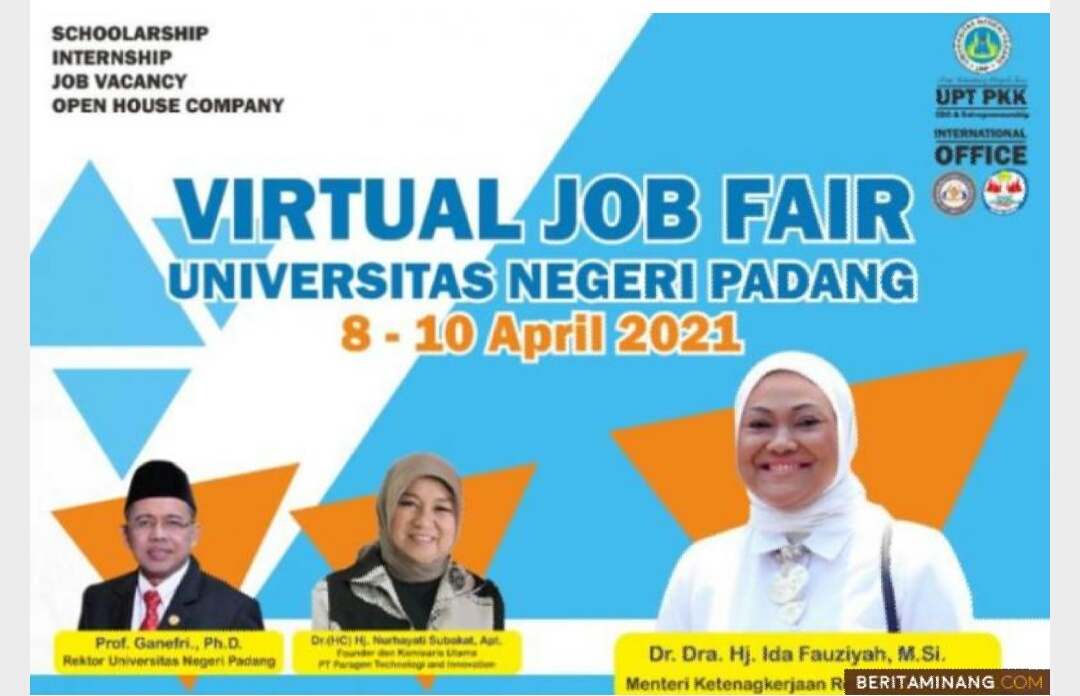 IWOSUMBAR.COM, PADANG – Untuk menjembatani lulusan perguruan tinggi dengan dunia industri dan dunia kerja (IDUKA) serta melanjutkan studi, informasi beasiswa baik dalam maupun luar negeri Unit Pelaksana Teknis Pengembangan Karir dan Kewirausahaan Universitas Negeri Padang (UPT PKK- UNP) bekerjasama dengan UPT Layanan Internasional melaksanakan “Virtual Job Fair and Scholarship Opportunities” Pada Tanggal 8 – 10 April 2021 (Hari ini Kamis, Jumat dan Sabtu)