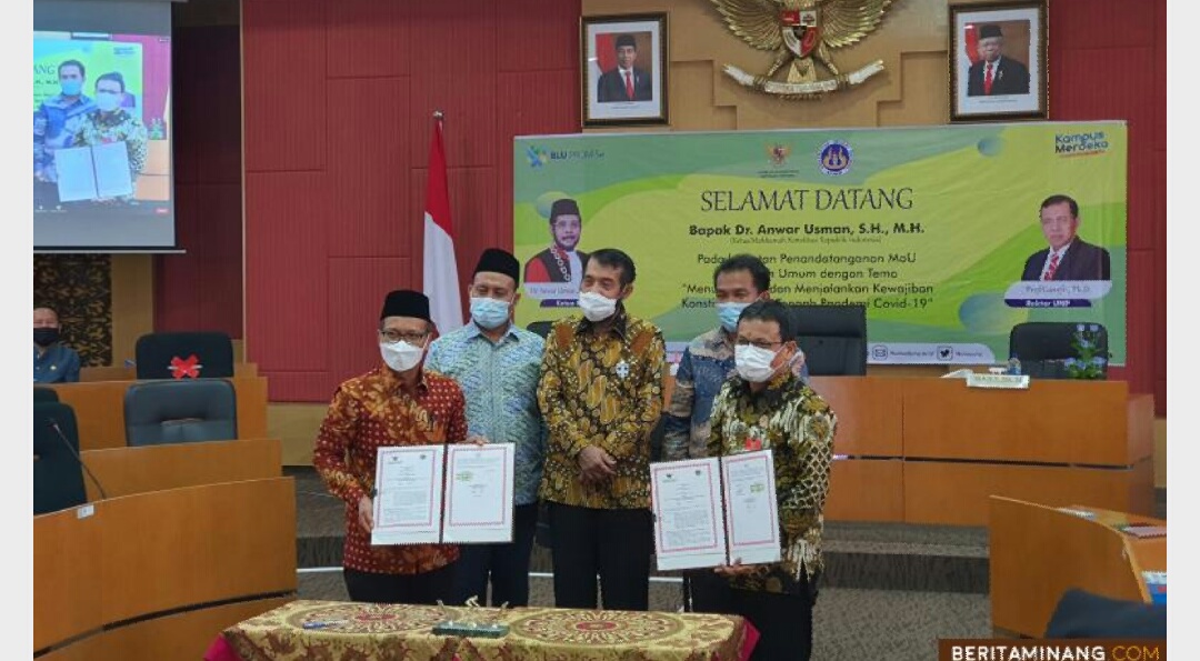 IWOSUMBAR.COM PADANG – Pimpinan Universitas Negeri Padang tanda tangani nota kesepahaman dengan Pimpinan Mahkamah Konstitusi Republik Indonesia serta melakukan kegiatan kuliah umum yang diikuti oleh pimpinan dan sivitas akademika. (26/3/2021)
