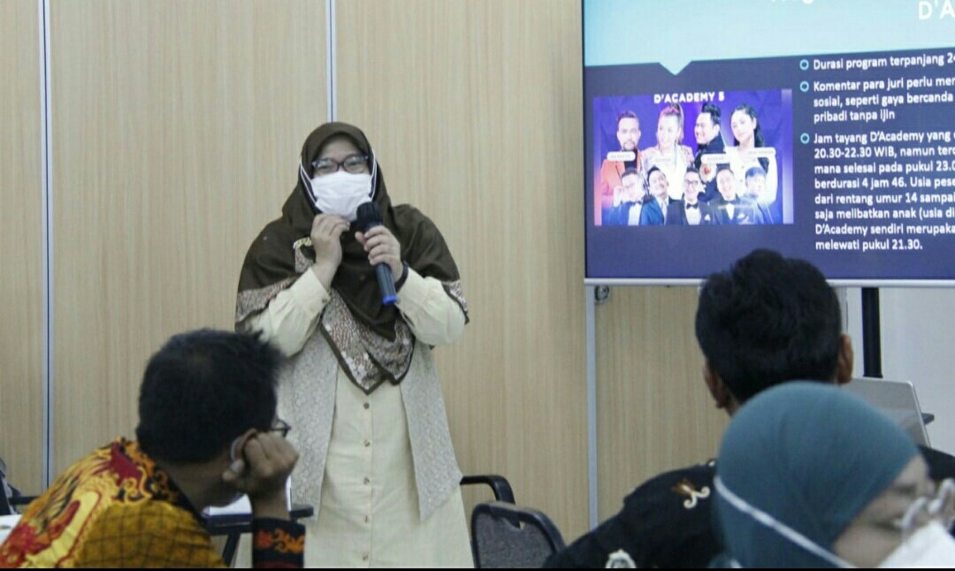 Kegiatan ini beragendakan evaluasi pada siaran televisi nasional, diantaranya stasiun RCTI, Indosiar. SCTV. Dr. Rini Sudarmanti, dan Tri Wahyuti, M.Si dalam presentasinya menjelaskan temuannya pada tayangan berita Indosiar, dimana masih adanya penggambaran kejahatan seksual yang dapat membuat penonton membayangkan atau bahkan seperti menyaksikan proses terjadinya peristiwa kejahatan seksual.