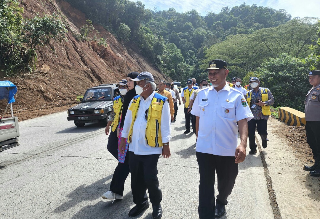 Sitinjau Lauik menjadi tujuan pertama rombongan. Menteri Basuki melihat langsung kondisi jalan nasional tersebut terutama pada titik longsor serta badan jalan yang rawan terban.