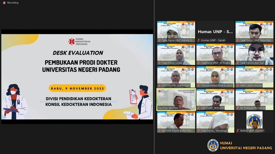 Iwosumbar.com, Padang —Dalam rangka pendirian prodi kedokteran di Universitas Negeri Padang, Konsil Kedokteran Indonesia (KKI) melakukan desk evaluation terhadap prodi kedokteran UNP melalui virtual teleconference zoom, Rabu (11/9).