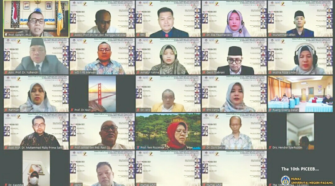 Iwosumbar.com, Padang– Fakultas Ekonomi Universitas Negeri Padang sukses menyelenggarakan Seminar Internasional, Padang International Conference on Economics, Education, Business and Accounting (PICEEBA) yang ke 10. Kegiatan dilakukan secara daring via aplikasi zoom dan juga disiarkan langsung melalui Youtube UNP Video Streaming.
