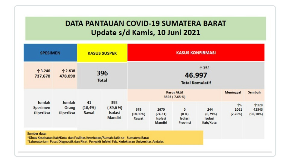 IWOSUMBAR.COM, PADANG – Satgas Covid Sumbar Jasman Rizal mencatat total sampai hari ini Kamis (10/6/2021) Total telah 46.997 orang Warga Sumbar terinfeksi covid-19. Dilaporkan penambahan kasus sebanyak 353 orang terkonfirmasi.
