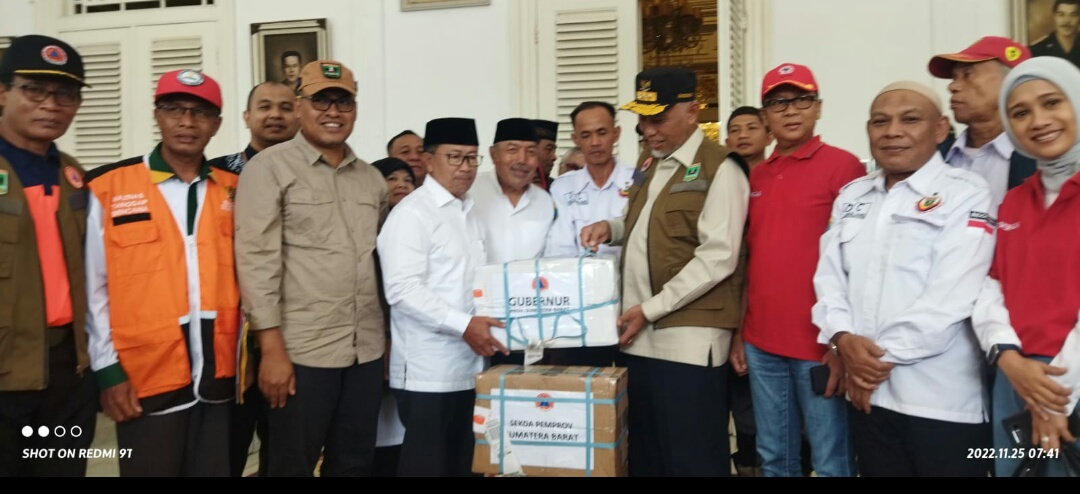 Iwosumbar.com, Padang – Bantu Korban gempa wilayah Cianjur, Gubernur Sumatera Barat, Mahyeldi secara simbolis menyerahkan bantuan berupa randang kepada masyarakat terdampak gempa dan longsor di Cianjur, Jawa Barat.