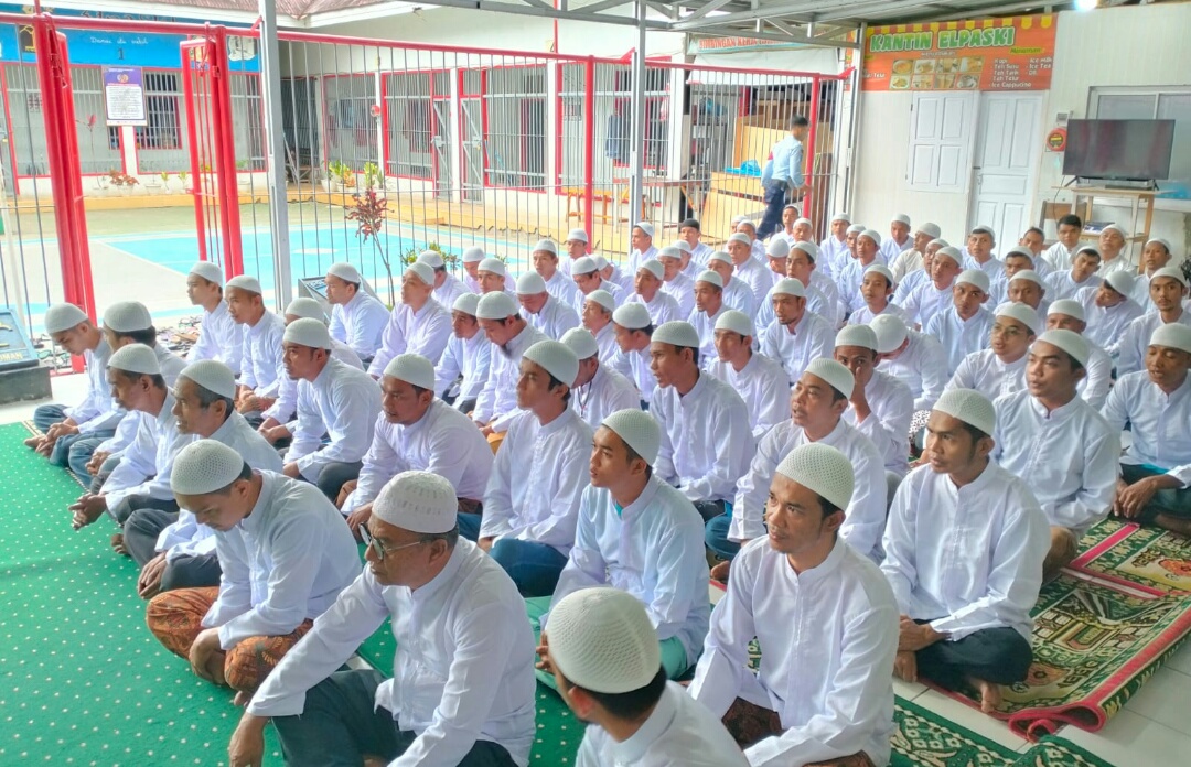 Para santri Warga Binaan kompak mengenakan seragam baju koko putih dan peci putih dengan semangat mendengarkan ceramah yang bercerita mengenai isra mi’raj Nabi Muhammad SAW.