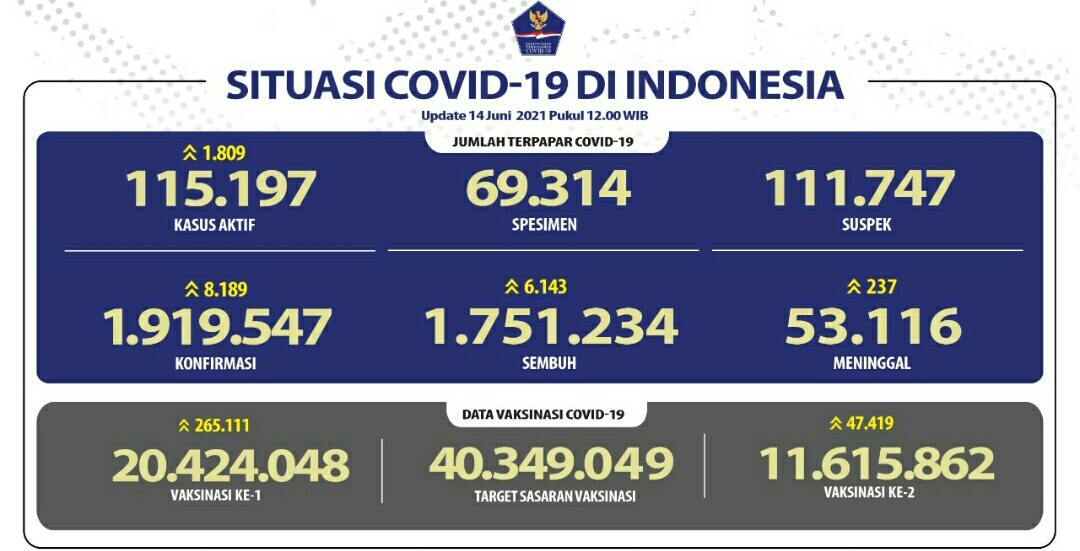 IWOSUMBAR.COM, JAKARTA – Perkembangan penanganan pandemi Covid-19 per 14 Mei 2021 tercatat pertambahan pasien sembuh hari ini sebanyak 6.143 kasus