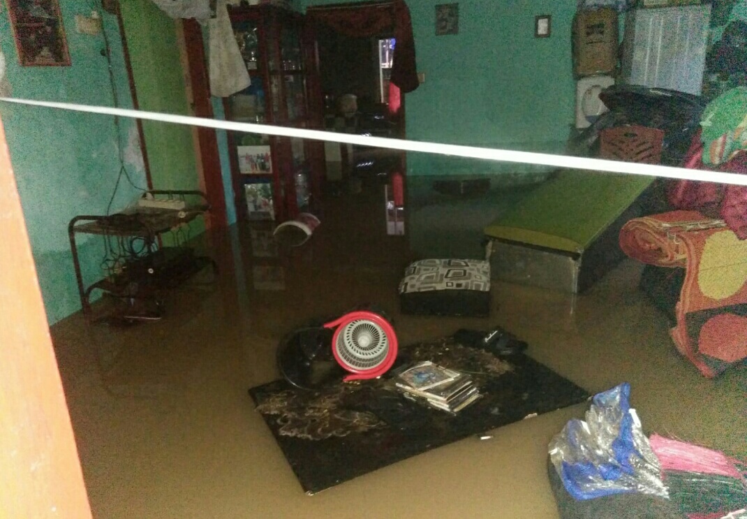 “Banjir menggenangi Jalan dan menggenangi 11 unit rumah warga, dengan ketinggian air 30-40 cm, “.