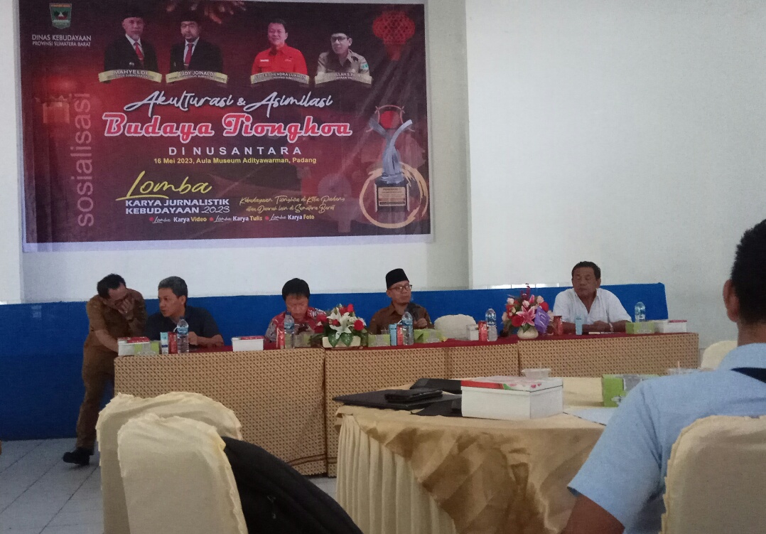 Panitia diskusi, dari Dinas Kebudayaan, Aprimas dalam laporannya menyampaikan, kegiatan Sosialisasi ini, selain mendiskusikan kebudayaan Akulturasi & Asimilasi Budaya Tionghoa di Sumbar, juga pentingnya peran wartawan guna melestarikan budaya di Sumatera Barat.