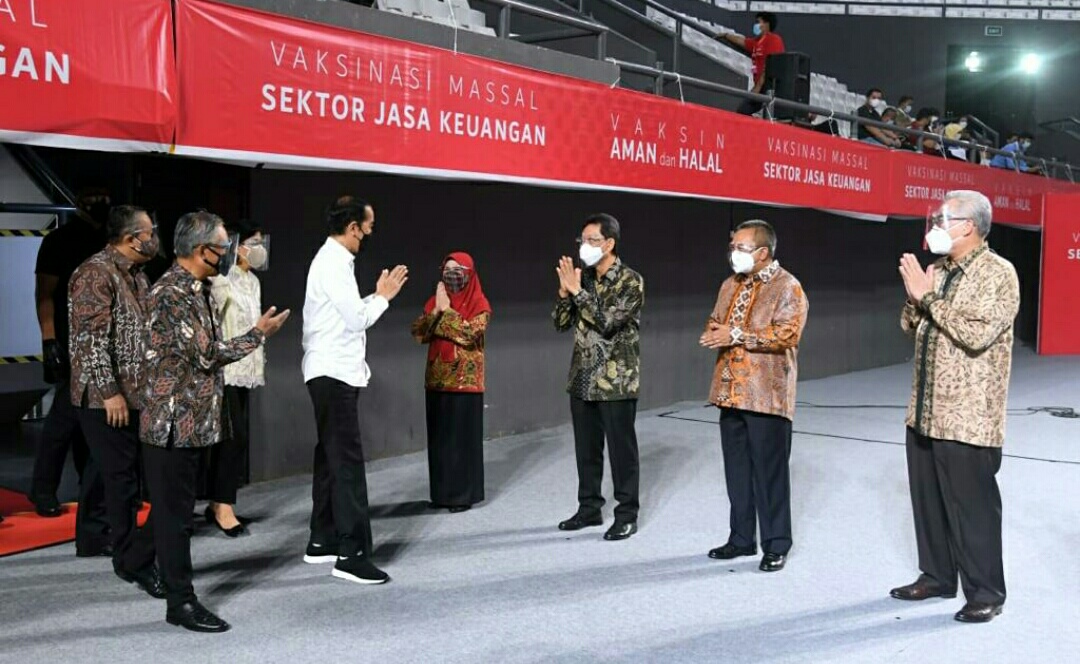“Pagi hari ini kita melaksanakan vaksinasi massal di sektor jasa keuangan yang diikuti kurang lebih 10 ribu peserta yang nanti targetnya kita dalam seminggu ini kurang lebih 100 ribu,” kata Presiden dilokasi vaksinasi.