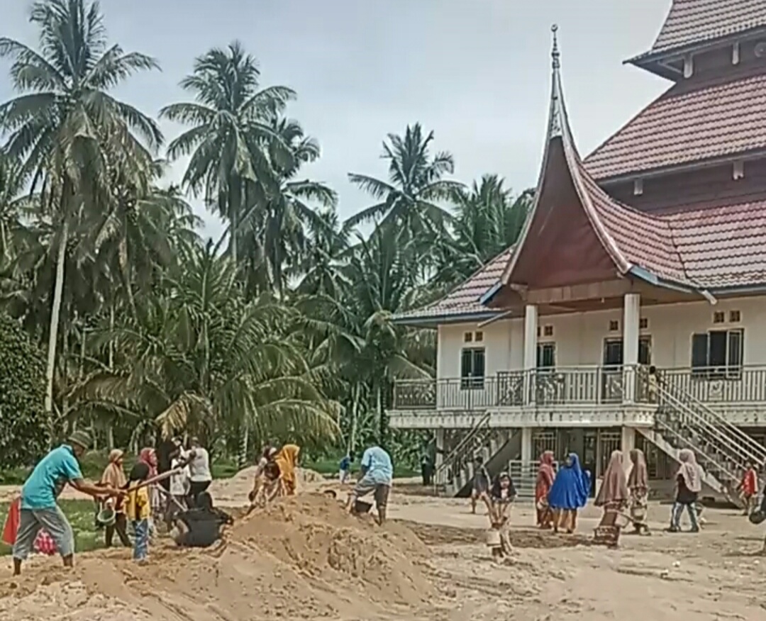Warga Korong Tanjung Medan terlihat semangat saat bergotong-royong bersama Jonfrizal Tanjung mendatarkan tanah timbunan dipelataran surau.