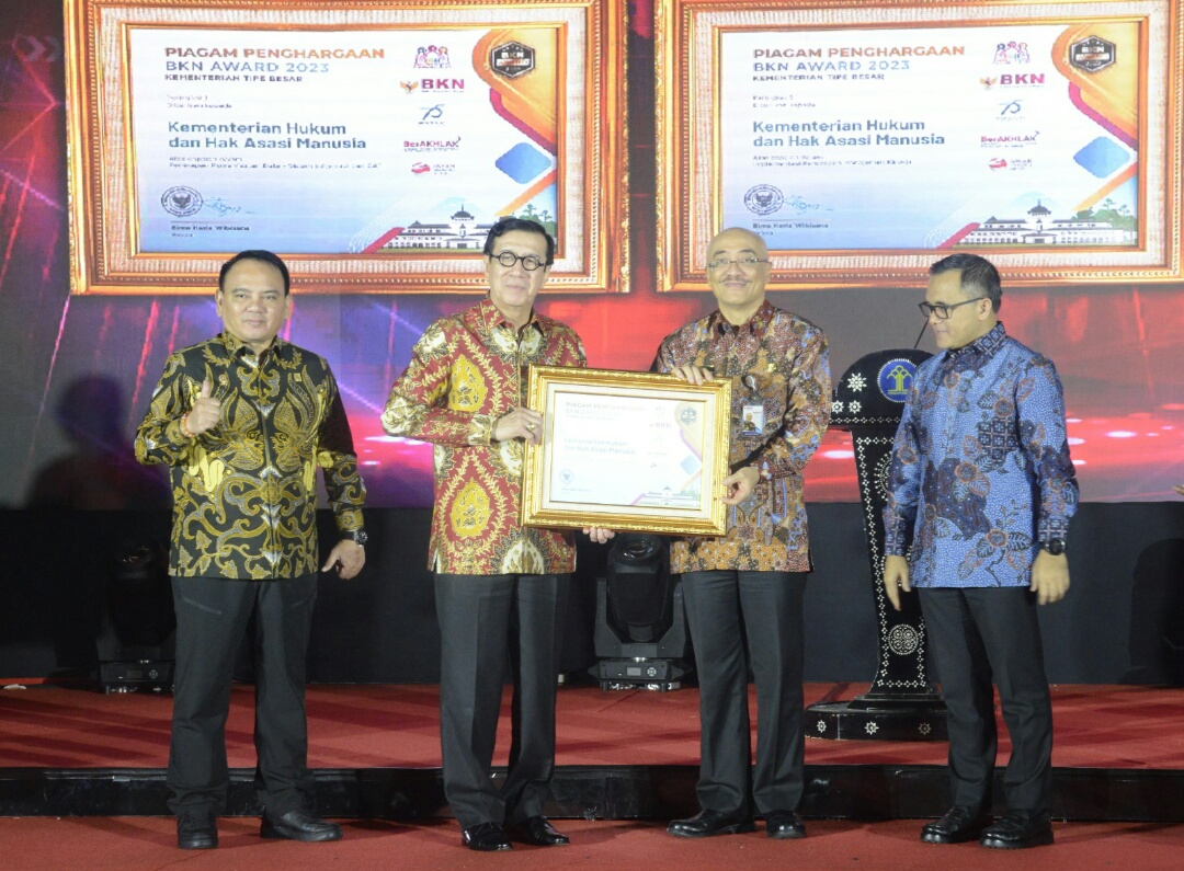 Terkini, Kemenkumham meraih penghargaan pada BKN Award 2023 dalam tiga kategori yaitu kategori utama Implementasi Norma Standar Prosedur Kriteria Manajemen ASN, kategori Pemanfaatan Data Sistem Informasi dan CAT dan kategori Implementasi Penerapan Manajemen Kinerja.