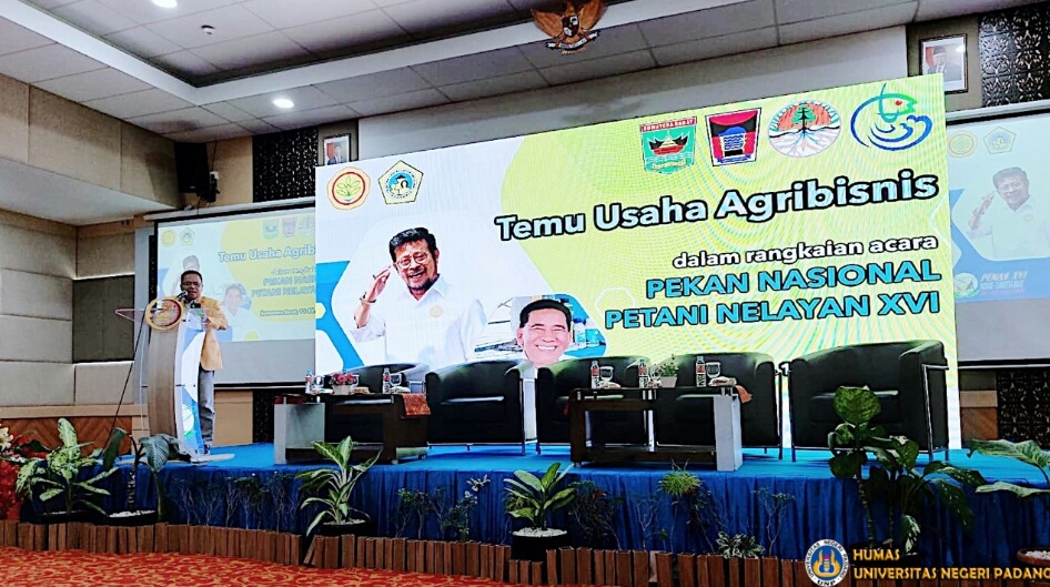 Kegiatan Pembukaan Temu Usaha Agribisnis PENAS (Petani Nelayan) XVI, Dekan Fakuktas Matematika dan Ilmu Pengetahuan Alam (FMIPA) UNP, Dr. Yulkifli, mewakili Rektor Ganefri, berkesempatan memaparkan materi dengan tajuk “Kontribusi UNP dalam Pengembangan Usaha Menengah dan Kecil”