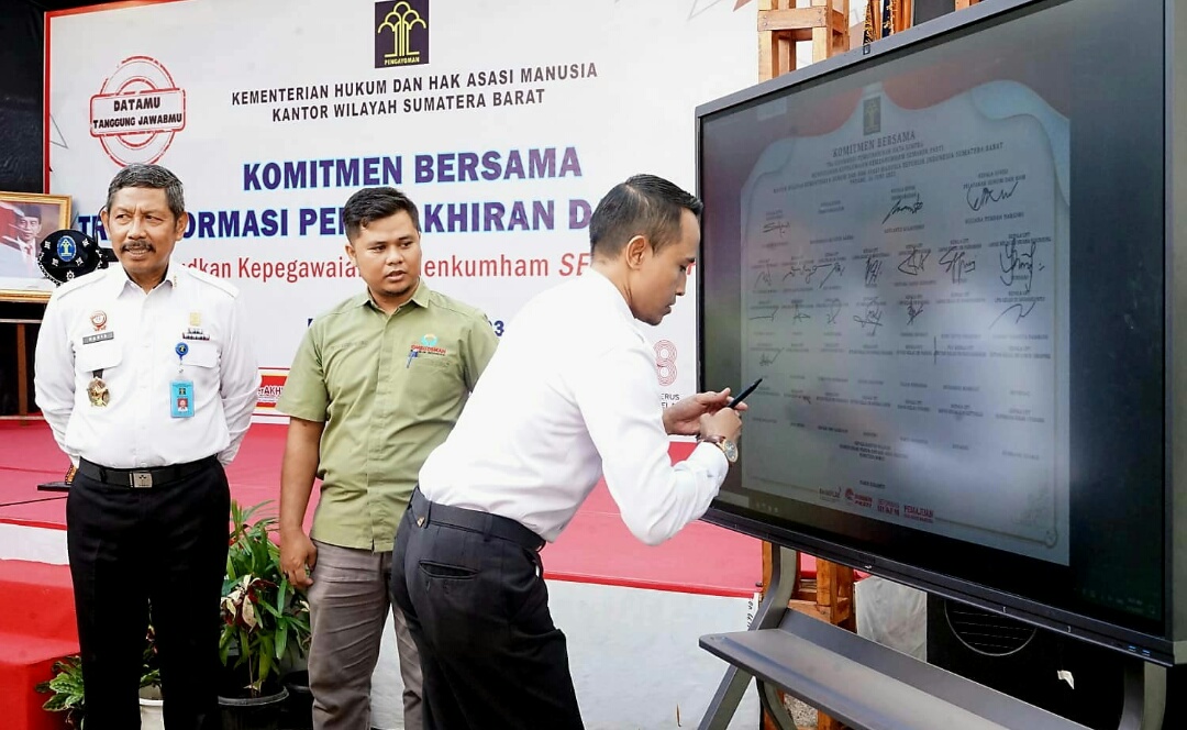 Acara Dilanjutkan Dengan Penandatangan Komitmen Bersama Tranformasi Pemutakhiran Data Simpeg Diawali Oleh Kepala Kantor Wilayah Kemenkumham Sumbar, Haris Sukamto Dan Dilanjutkan Oleh Kepala Divisi Administrasi, Ramelan Suprihadi Serta Dilanjut Oleh Para Kepala Unit Pelaksana Teknis (Ka.Upt) Se-Sumatera Barat. (**)