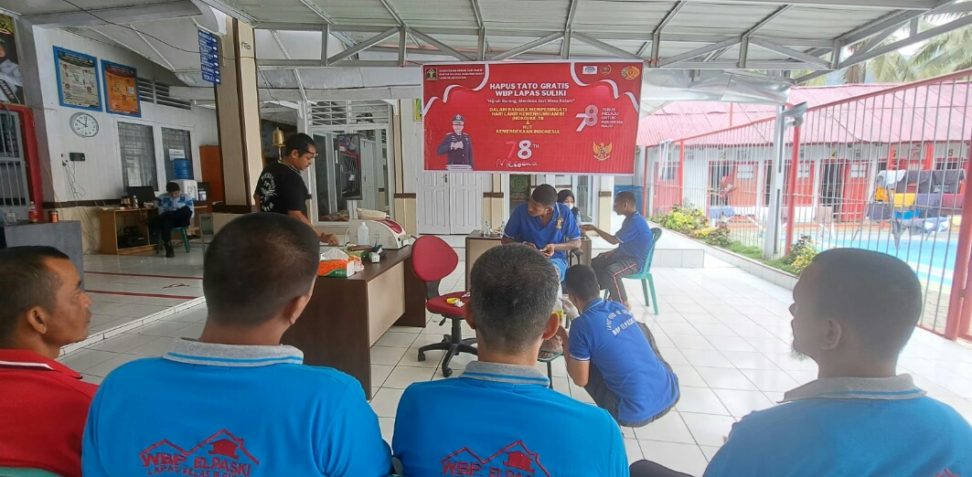 IWOSUMBAR.COM, PADANG – Sambut Bulan Kemerdekaan RI. Lembaga Pemasyarakatan Kelas III Suliki menggelar kegiatan Hapus Tato yang ke 3 kalinya yang juga dalam rangka memperingati Hari Lahir Kementerian Hukum dan Hak Asasi Manusia (Kemenkumham) Republik Indonesia ke-78. Selasa (1/8/23)