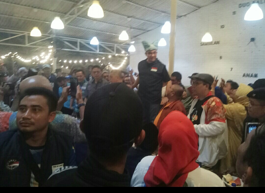 Setiba di Sate Minangkabau Anies Baswedan langsung dikerubuti oleh ratusan simpul relawan yang memang telah menunggu kedatangan dirinya sejak sore hari.