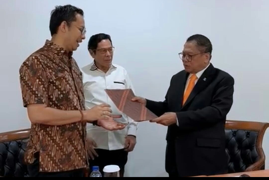 ket, poto (Ketua Umum DPP Gebu Minang Oesman Sapta Odang menyerahkan SK Sekjen Gebu Minang kepada Yuliandre Darwis, di Lantai 18, Gedung City Tower, Jakarta, Rabu (16/8/2023).