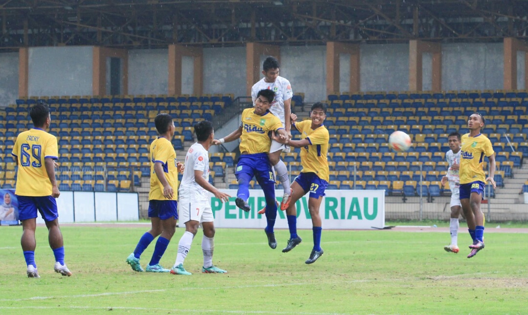 Baru saja kick off, pilar Sumatera Barat, Gibran Tito Kurniawan berhasil mengancam gawang Riau yang di kawal Govindra.