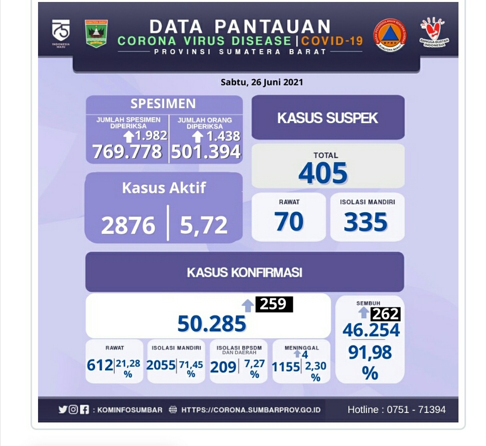 IWOSUMBAR.COM, PADANG – Satgas Covid Sumbar Jasman Rizal mencatat total sampai hari ini Sabtu (26/6/2021) telah 50.285 orang Warga Sumbar terinfeksi covid-19. Terjadi penambahan 259 kasus warga terkonfirmasi.