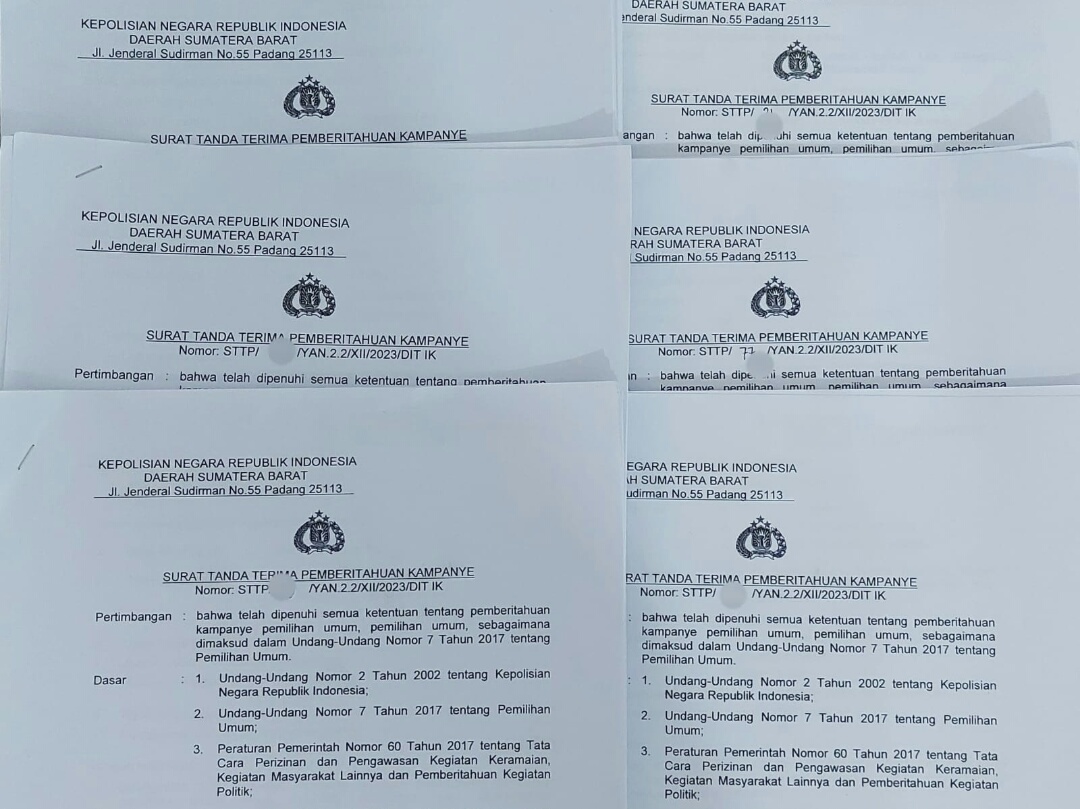 IWOSUMBAR.COM, PASANG – Selama tiga minggu sejak dimulainya kampanye sesuai tahapan Pemilu 2024, Polda Sumatera Barat (Sumbar) telah menerbitkan ratusan Surat Tanda Terima Pemberitahuan (STTP) Kampanye bagi peserta pemilu.