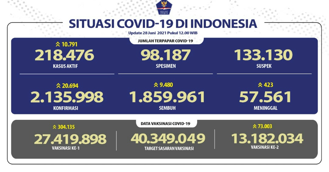 Adapun kasus penambahan positif juga bertambah berjumlah sebanyak 20.694 orang. Sehingga total kasus positif telah berjumlah sebanyak 2.135.998 kasus.