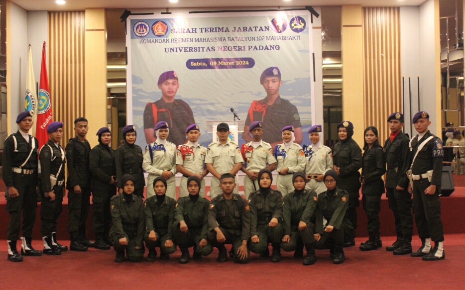 IWOSUMBAR.COM, PADANG- RESIMEN Mahasiswa Batalyon 102 Mahabhakti Universitas Negeri Padang (UNP), pada Sabtu (9/3 2024) melaksanakan kegiatan Serah Terima Jabatan (Sertijab) dari Komandan periode 2023-2024, Robi’ul Amin ke Komandan periode 2024-2025, Rendi Riano.