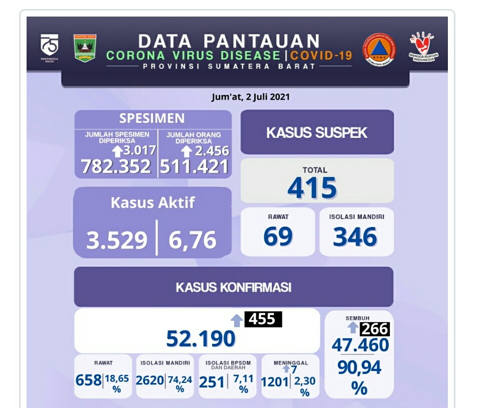 IWOSUMBAR.COM, PADANG – Satgas Covid Sumbar Jasman Rizal mencatat total sampai hari ini Jumat (2/7/2021) Total seluruhnya telah 52.190 orang Warga Sumbar terinfeksi covid-19. HARI INI Terjadi penambahan 455 KASUS warga terkonfirmasi.