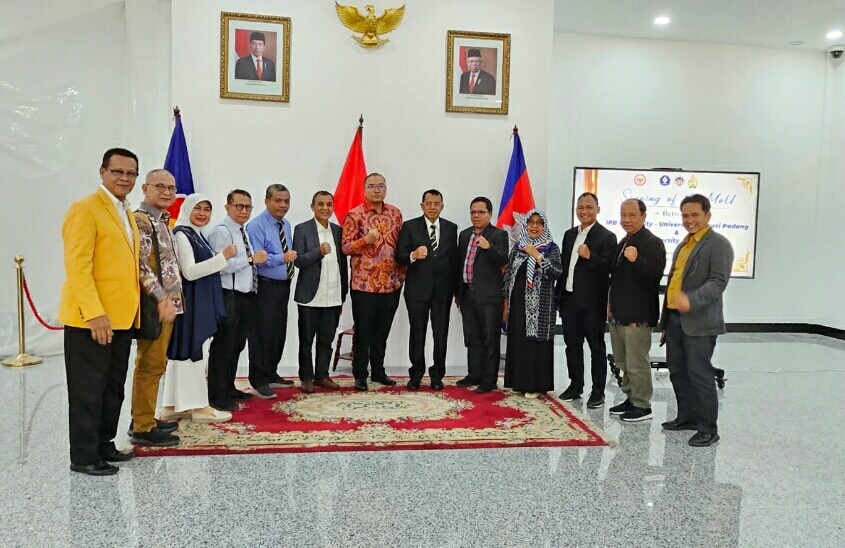 Universitas Negeri Padang (UNP) menandatangani Nota Kesepahaman (MoU) dengan Royal University of Agriculture Phnom Penh Kamboja, Kamis (21/3) di Ruang Pertemuan Kedutaan Besar RI Pnhom Phenh.