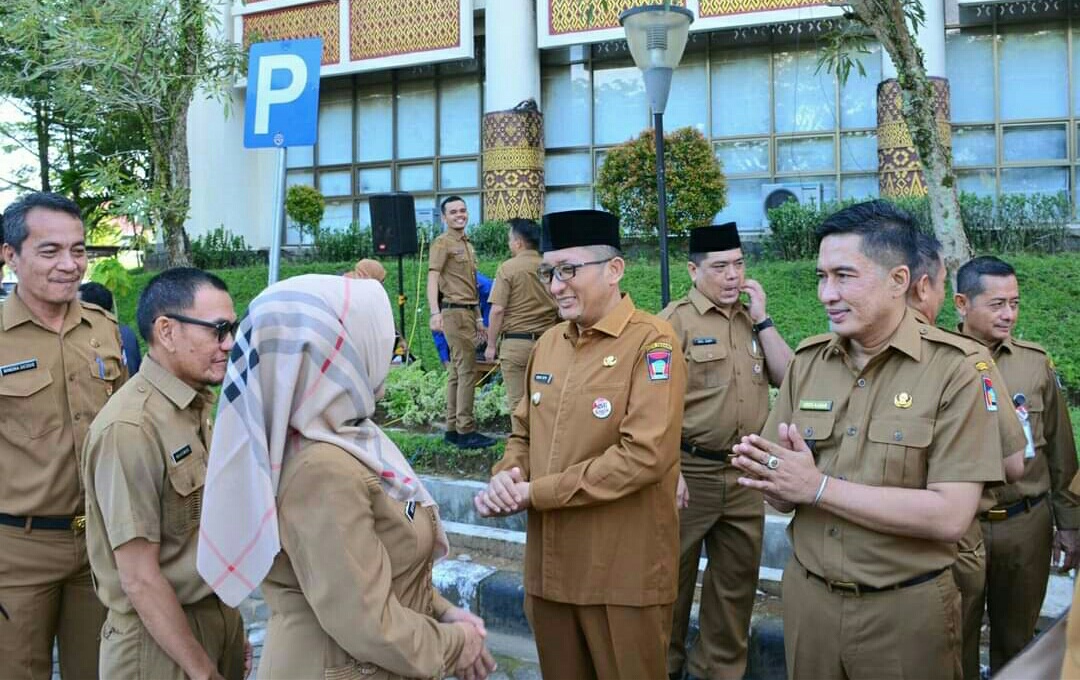 IWOSUMBAR.COM, PADANG – Apel perdana masuk kantor usai cuti lebaran, Wali Kota Padang Hendri Septa dan Wakil Wali Kota Ekos Albar saling bersalaman bermaaf maafan dengan seluruh ASN di Balaikota Padang, Selasa (16/4/2024).