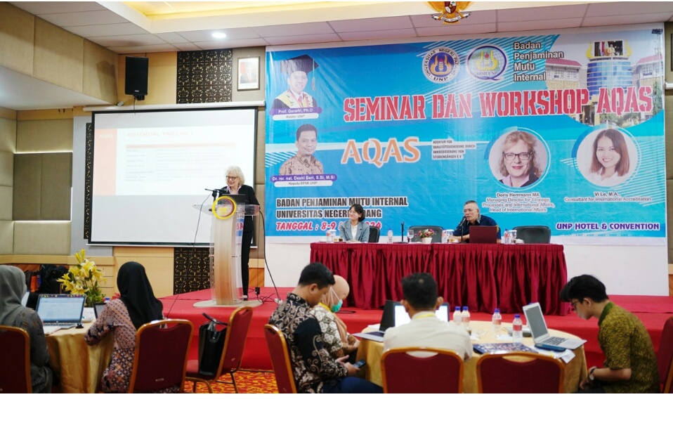 IWOSUMBAR.COM, PADANG- UNIVERSITAS Negeri Padang (UNP) selenggarakan Seminar dan Workshop Akreditasi Internasional Agency for Quality Assurance through the Accreditation of Study Programmes (AQAS), Rabu-Kamis (8-9 Mei 2024) di Ballroom Singgalang UNP Hotel and Convention, Kampus Air Tawar UNP.