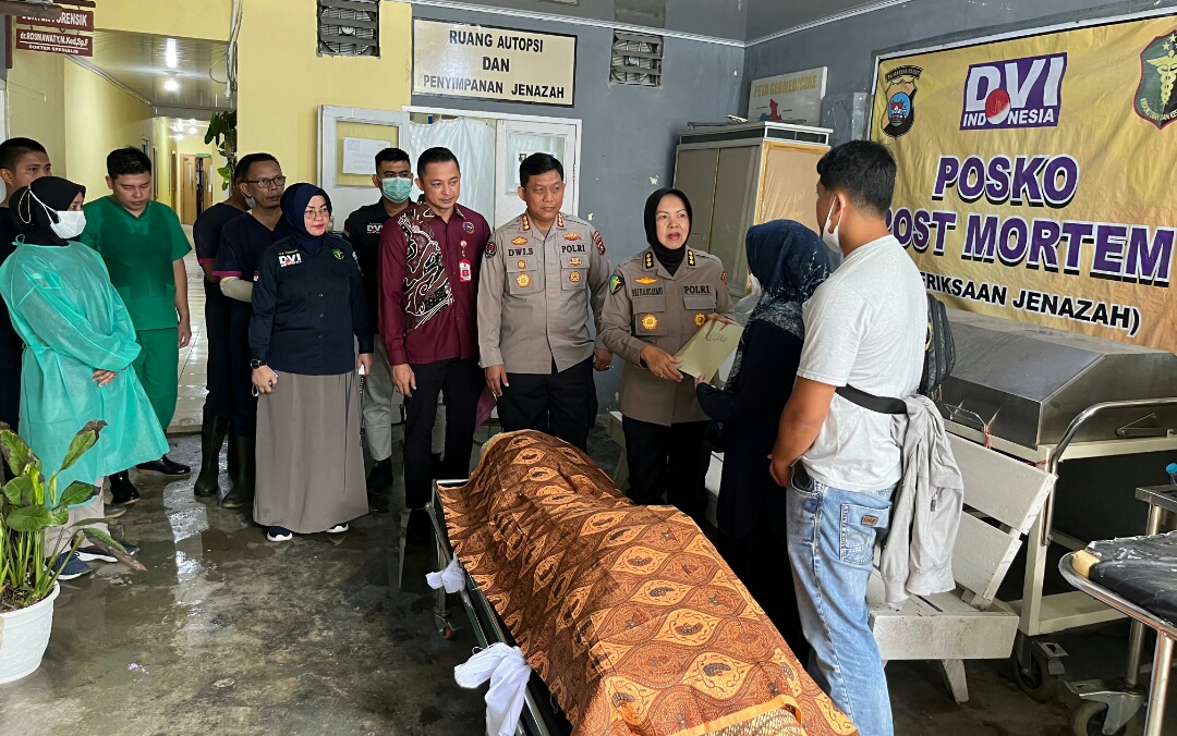 Saat penyerahan jenazah pada keluarga terkait turut disaksikan oleh Kabid Humas Polda Dwi Sulistyawan, S.Ik. dan Karumkit Bhayangkara Padang Kompol dr. Dedet Steavano, M.Ked (OG)., Sp.OG.