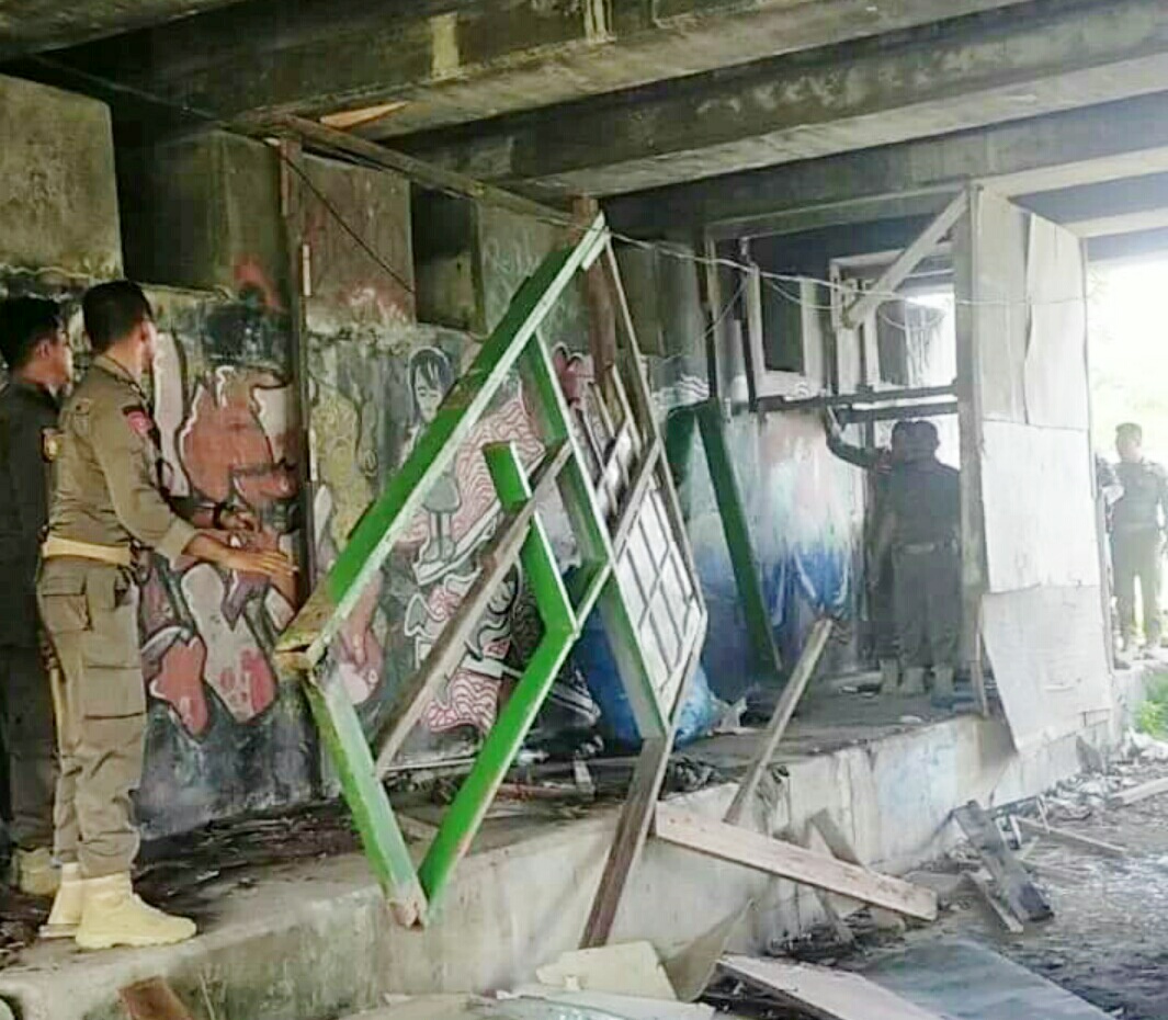 Sebanyak 4 lapak milik PKL dan 1 bangunan liar dibongkar langsung oleh petugas Satpol PP Padang yang berada di Kawasan Pantai Padang, tepatnya dibawah jembatan danau cimpago. Sabtu (6/7/24).