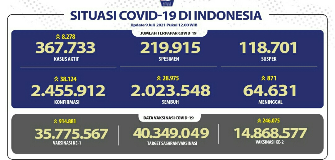 IWOSUMBAR.COM, JAKARTA – Perkembangan penanganan pandemi Covid-19 per 9 Juli 2021 tercatat pertambahan pasien sembuh hari ini sebanyak 28.975 kasus