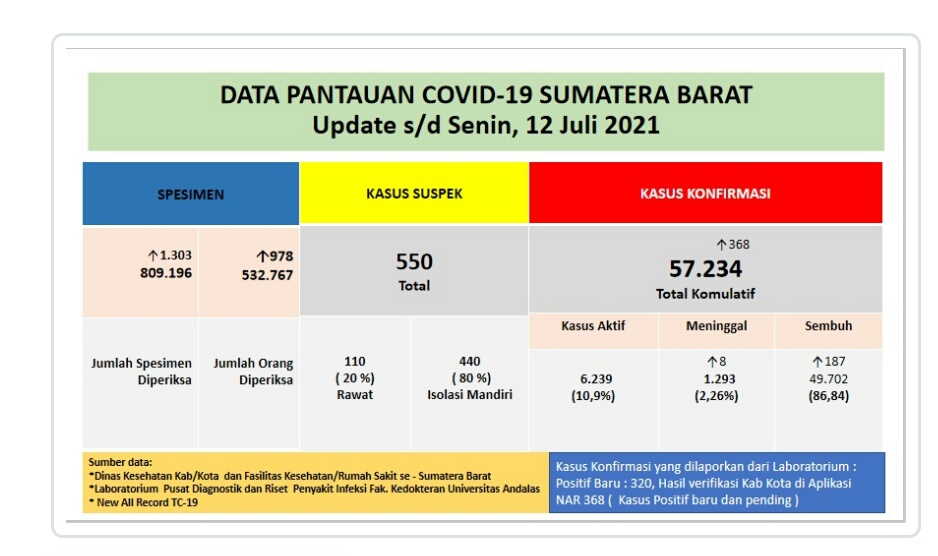 IWOSUMBAR.COM, Juru bicara Covid-19 Sumatera Barat mencatat Total sampai hari ini Senin (12/7/2021) telah 57.234 orang warga Sumbar terinfeksi covid-19. Dilaporkan Terjadi penambahan 368 kasus warga sumbar positif terinfeksi.