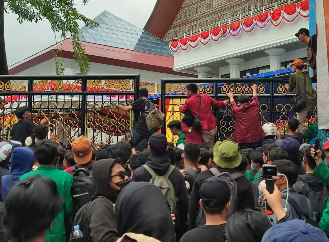 IWOSUMBAR.COM, PADANG- Ratusan pendemo yang tergabung dalam aksi “Selamatkan Republik, Kawal Putusan Mahkamah Konstitusi (MK)” menyampaikan orasi di depan Gedung DPRD Sumatera Barat (Sumbar) dari pagi hingga menjelang sore.