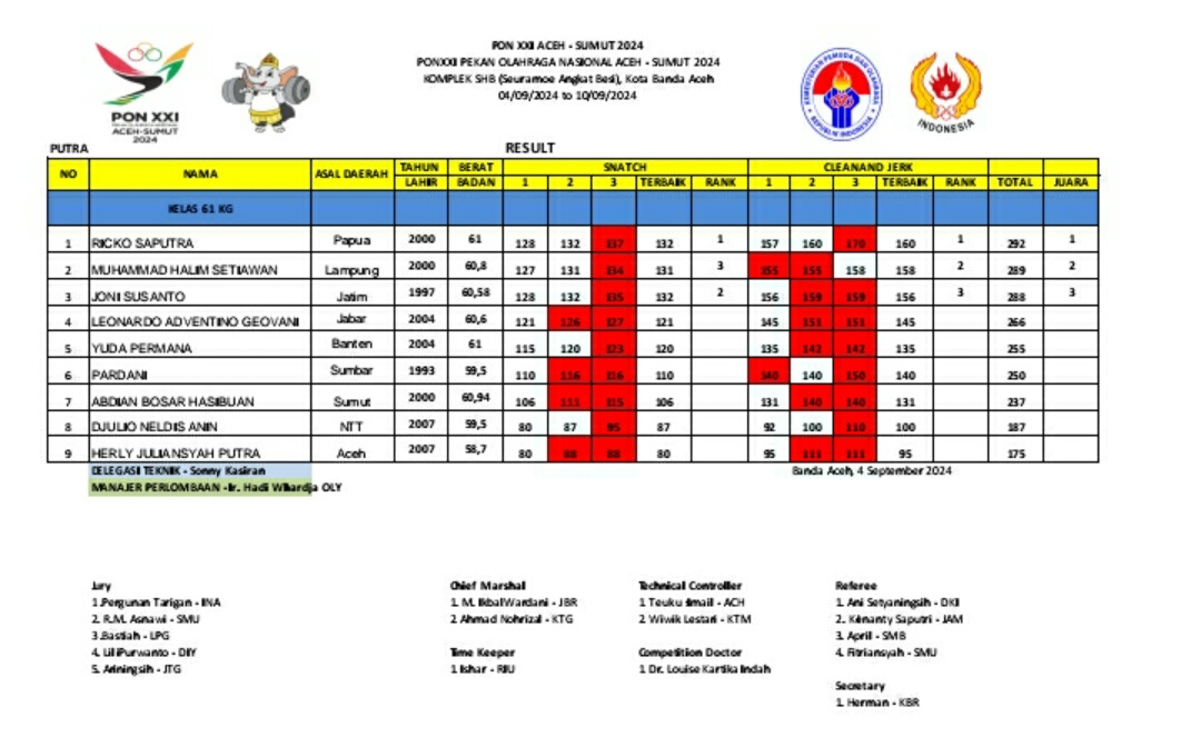 Medali emas di kelas ini di raih Lifter Papua, Picko Saputra dengan total angkatan 292 Kg.
