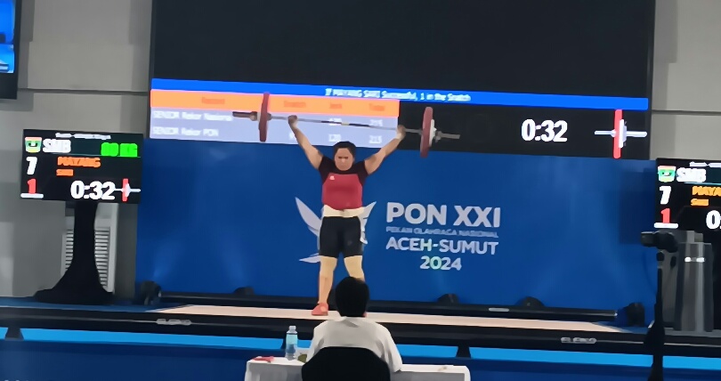 IWOSUMBAR.COM, ACEH- Lifter putri Sumatera Barat (Sumbar), Mayang Sari, tampil di Kelas 76 Kg Cabang Angkat Besi pada PON XXI Aceh-Sumut, hanya berhasil finis di posisi 7 dari 9 lifter yang bertanding.