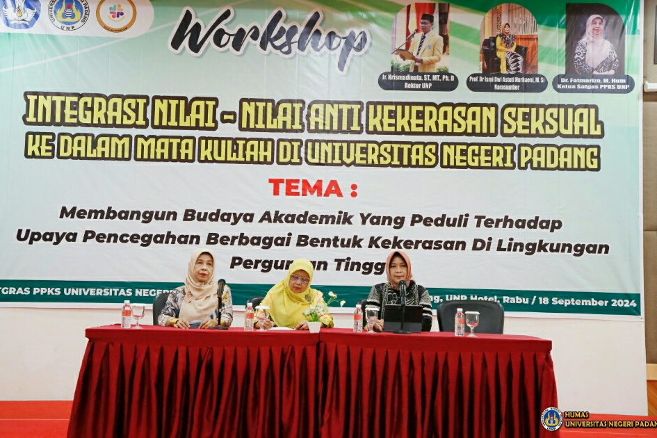 IWOSUMBAR.COM, PADANG- Universitas Negeri Padang (UNP) gelar workshop berema “Integrasi Nilai-Nilai Anti Kekerasan Seksual dalam Mata Kuliah Wajib Universitas dan Mata Kuliah di Departemen” pada Rabu, 18 September 2024.