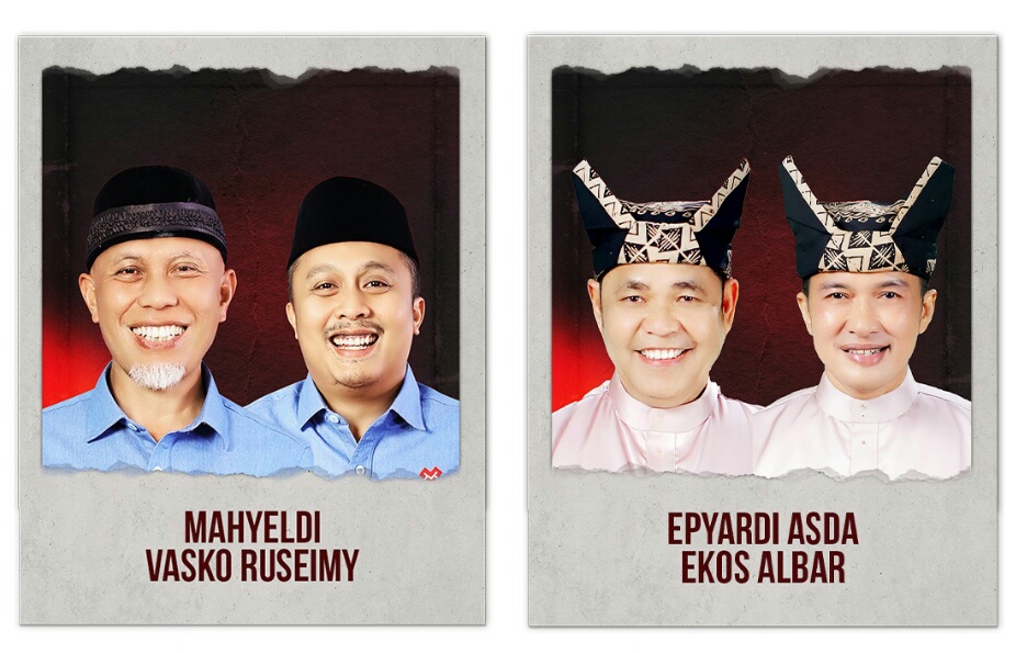 Pasangan pertama adalah H. Mahyeldi, SP dan Vasko Ruseimy, S.T, yang didukung oleh lima partai politik: PKS, Partai Gerindra, Partai Demokrat, PBB, dan Perindo, dengan total akumulasi suara sah sebanyak 1.200.925.