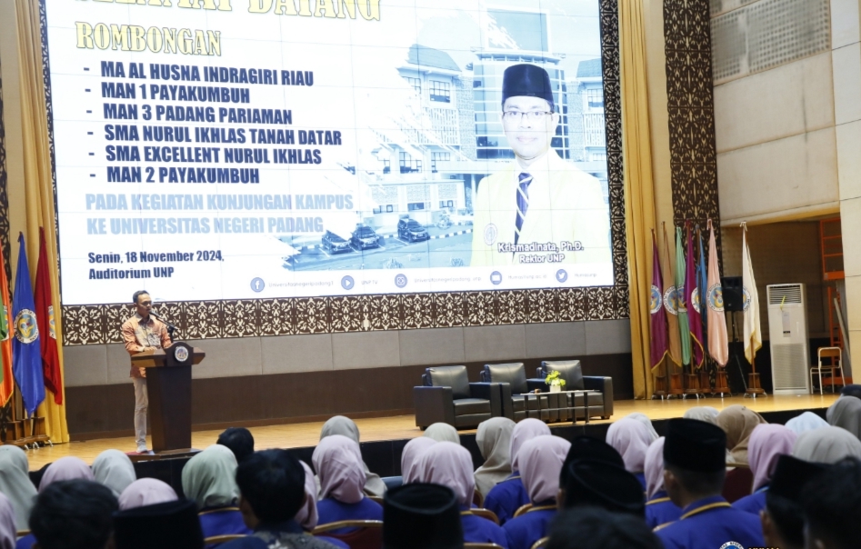 IWOSUMBAR.COM, PADANG -Universitas Negeri Padang (UNP) salah satu perguruan tinggi favorit di Sumatera Barat. Senin 18 November 2024 kembali kedatangan 600 siswa dari enam sekolah menengah atas dan madrasah aliyah (SMA/MA) asal Sumatera Barat dan Riau.