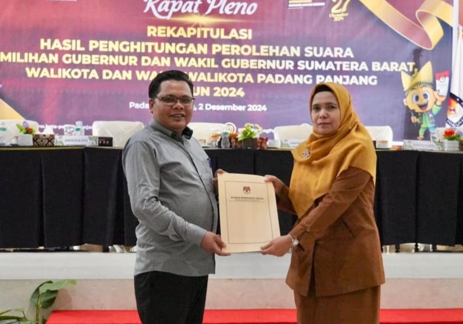 IWOSUMBAR.COM, Padangpanjang – Pasangan calon (paslon) nomor urut 1 dalam Pemilihan Gubernur dan Wakil Gubernur Sumatera Barat 2024, H. Mahyeldi, SP -Vasko Ruseimy, ST, berhasil meraih suara terbanyak di Kota Padangpanjang dengan perolehan 24.556 suara.