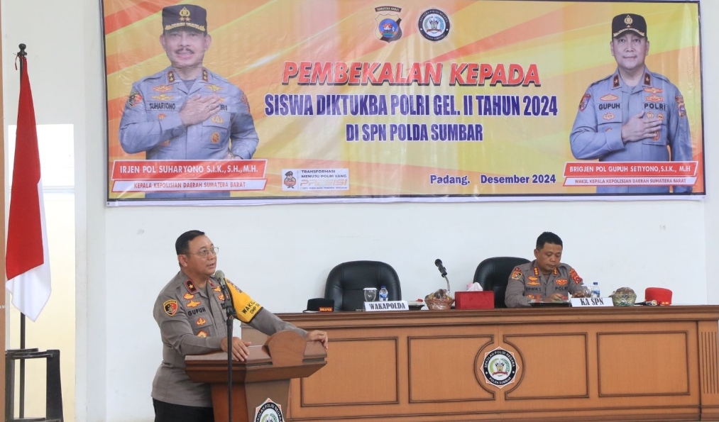 IWOSUMBAR.COM, Wakapolda Brigjen Gupuh Setiyono, memberikan pembekalan kepada Siswa Diktukba Polri bertempat di Sekolah Polisi Negara (SPN) Polda Sumbar, Senin (09/12). Dihadiri Karo SDM, Dir Samapta, Kabid Propam dan Ka SPN Polda dan seluruh Siswa Diktukba.