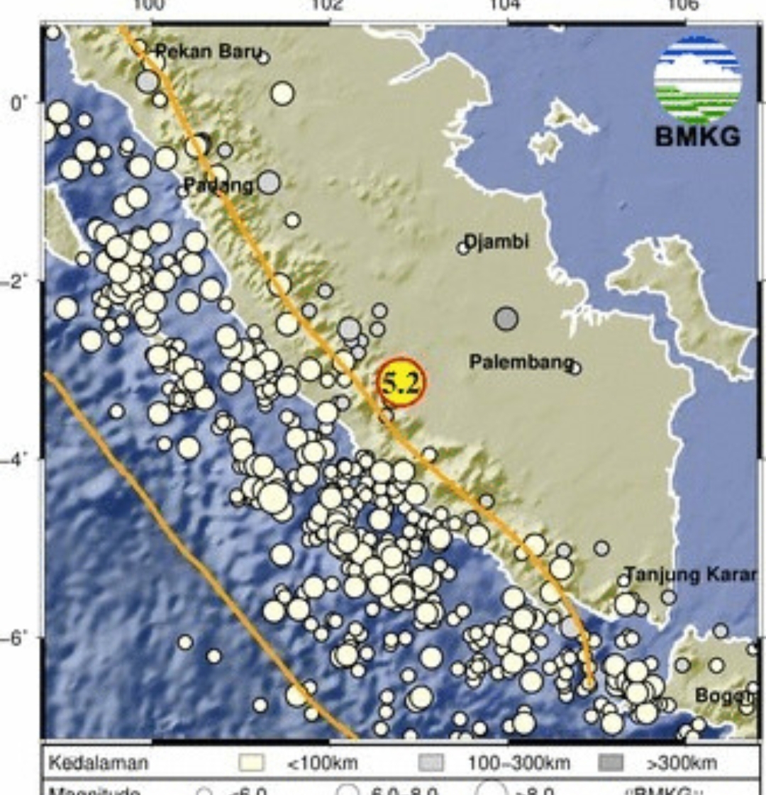 Gempa berpusat di koordinat 3,14° LS dan 102,80° BT, dengan kedalaman 219 km. Lokasi gempa berada di wilayah Selatan Sumatra, Indonesia.