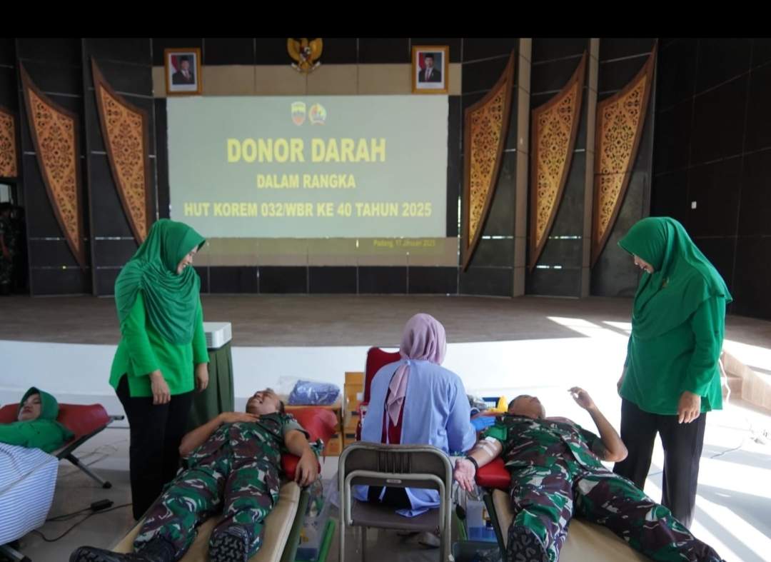 Korem 032/Wirabraja menggelar aksi donor darah massal di Gedung Sapta Marga, Makorem 032/Wbr, Jl. Sudirman No. 29 Padang, Kamis (16/1/2025). Kegiatan ini diadakan dalam rangka memperingati Hari Ulang Tahun Korem ke-40 sekaligus HUT ke-79 Persit Kartika Chandra Kirana.