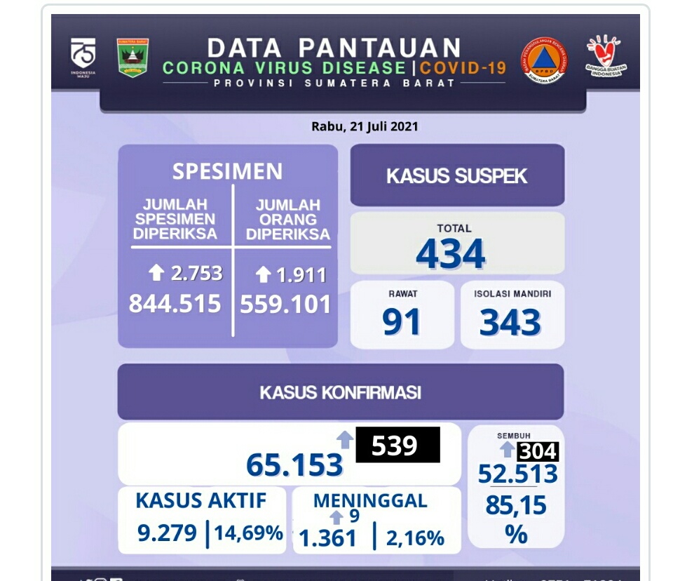 IWOSUMBAR.COM, PADANG – Satgas Covid-19 Sumbar Jasman mencatat, total sampai hari ini Rabu (21/7/2021) telah 65.153 orang warga Sumbar terinfeksi covid-19. Hari ini terjadi penambahan 539 kasus warga terkonfirmasi positif terinfeksi covid-19.
