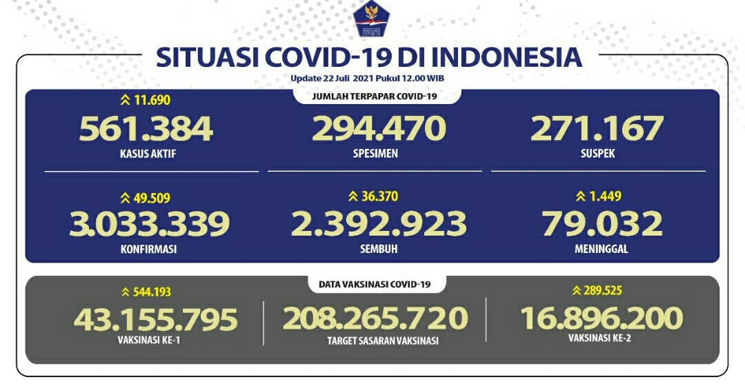 IWOSUMBAR.COM, JAKARTA – Perkembangan penanganan pandemi Covid-19 per 22 Juli 2021 tercatat pertambahan pasien sembuh hari ini sebanyak 36.370 kasus