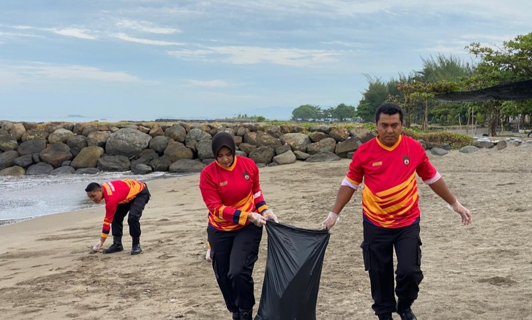 Kegiatan ini melibatkan personel Kepolisian dari Satker Ditpamobvit Polda Sumbar yang dengan penuh semangat membersihkan sampah plastik, kayu, dan berbagai jenis limbah yang mengotori pesisir pantai.