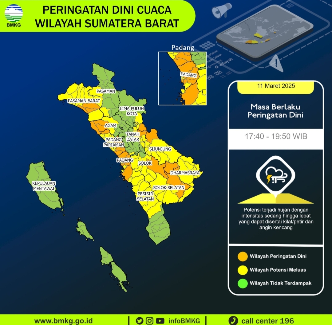 IWOSUMBAR.COM, PADANG- Badan Meteorologi, Klimatologi, dan Geofisika (BMKG) Sumatera Barat mengeluarkan peringatan dini cuaca pada Selasa (11/3) pukul 17.30 WIB.