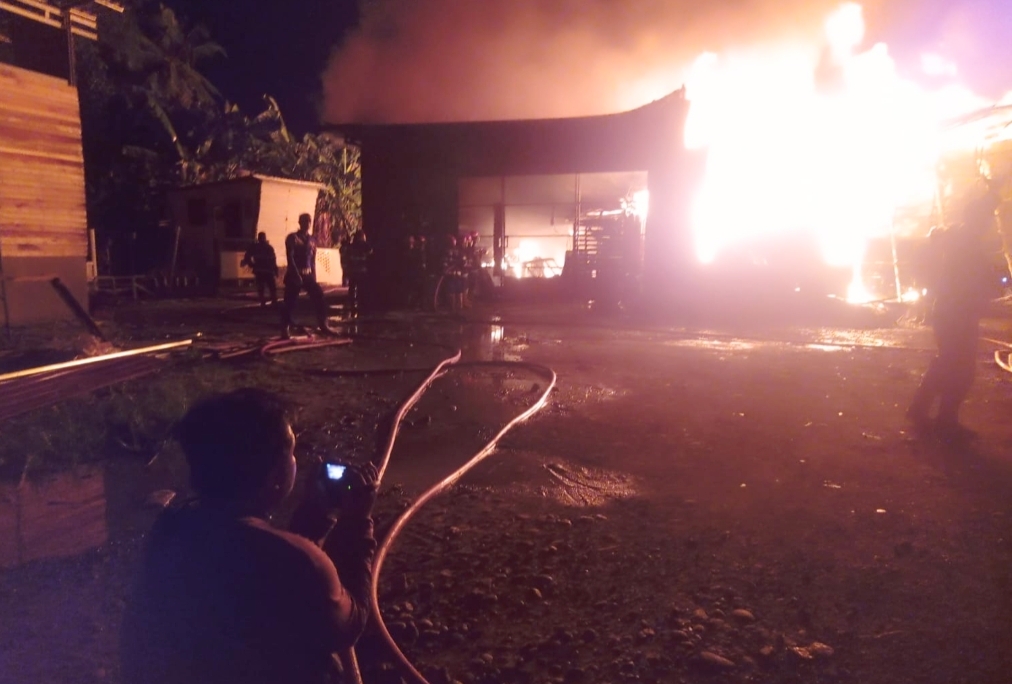 Api pertama kali terlihat sekitar pukul 21.50 WIB dari kamar karyawan sebelum akhirnya membesar dan menghanguskan bangunan serta sejumlah kendaraan di lokasi.